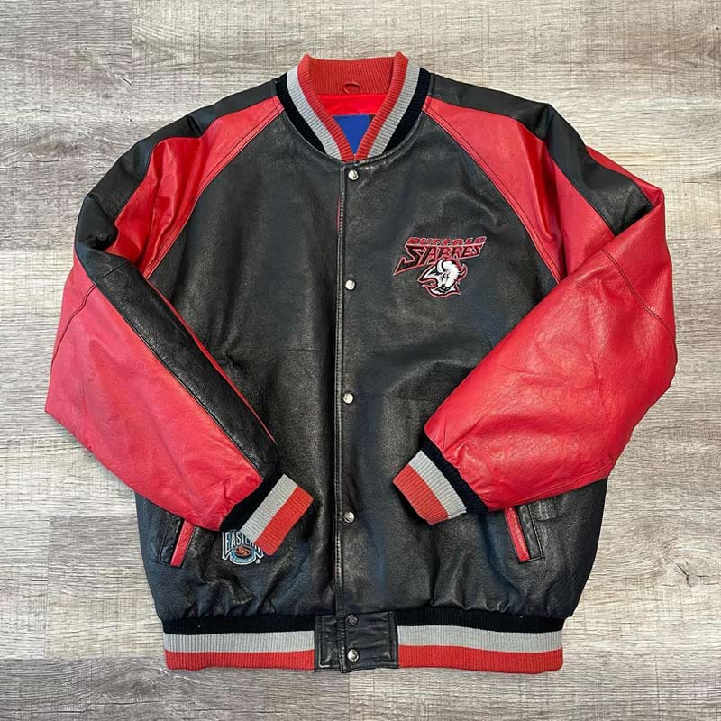 The Buffalo Sabres 1990’s Varsity Leather Jacket is a vintage-inspired piece that honors the team’s historic presence in the NHL. Worn with pride by fans, the Buffalo Sabres 1990’s Varsity Leather Jacket reflects the energy and culture of 1990s hockey, an era marked by unforgettable players and intense rivalries. With its varsity leather design, this jacket celebrates both sports heritage and team loyalty, making it a perfect addition for Sabres supporters who want to showcase their devotion in classic style.