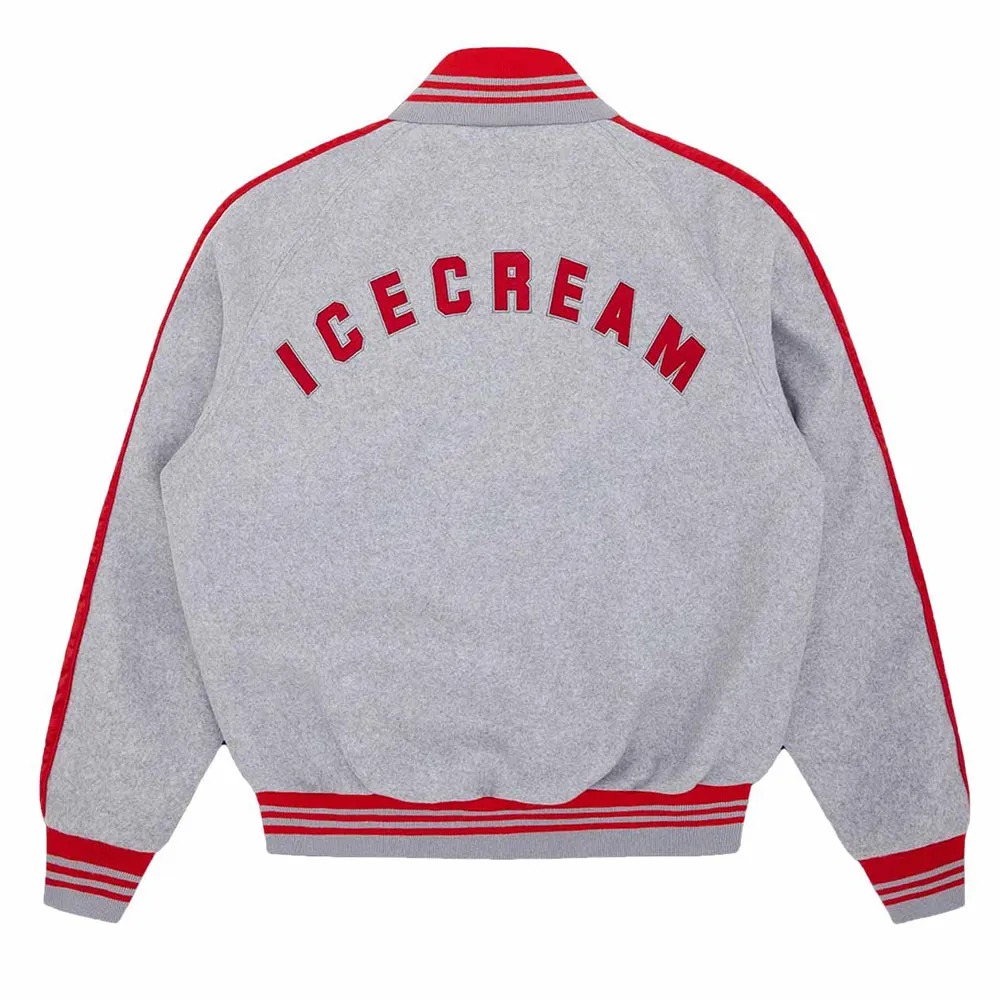 Tags: classic varsity, Cones and Bones ICECREAM, Gray jacket, Iconic Streetwear, Retro style, streetwear jacket, Trendy Jacket, Urban Apparel, varsity jacket, Vintage Fashion