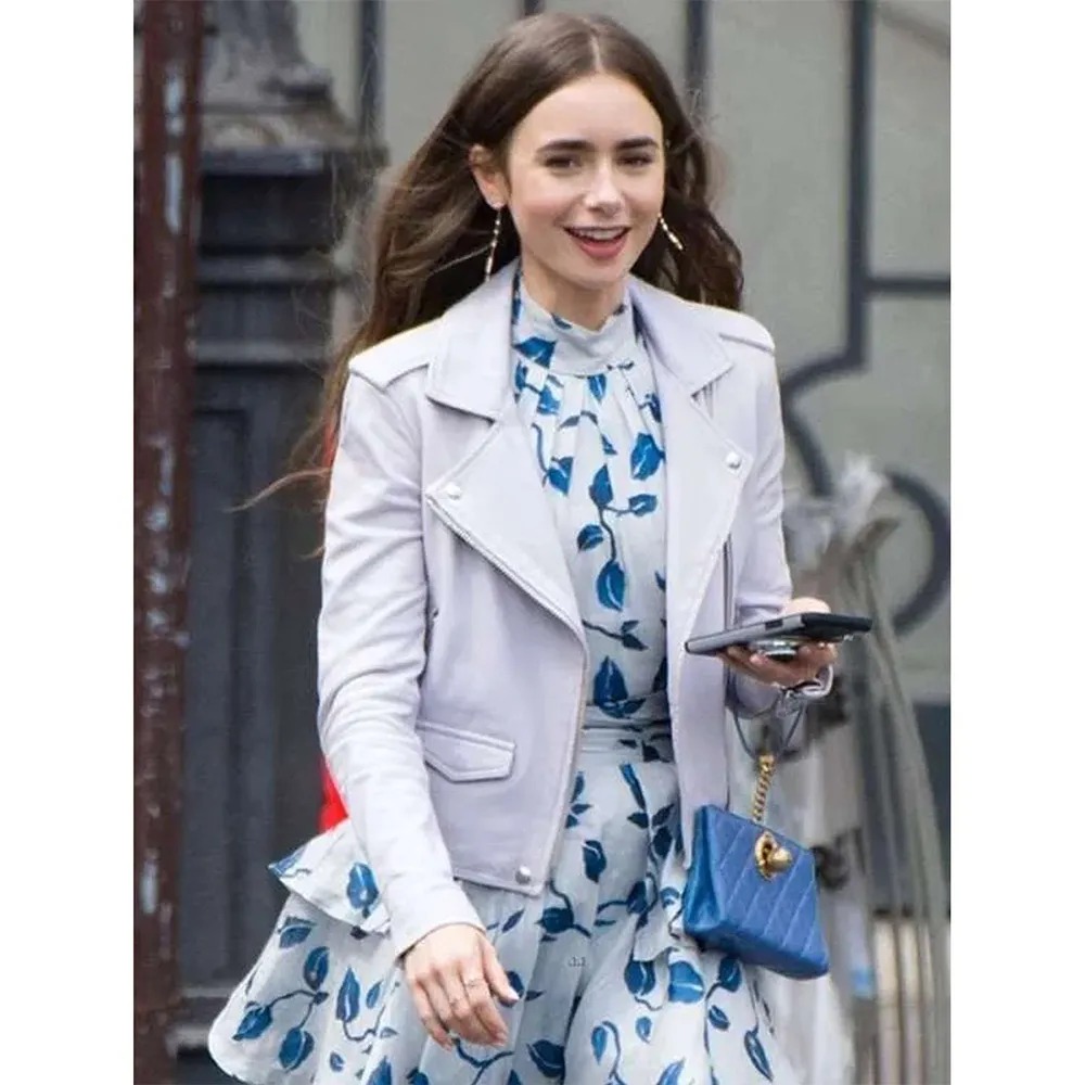 Emily in Paris Lily Collins Light Blue Leather Jacket