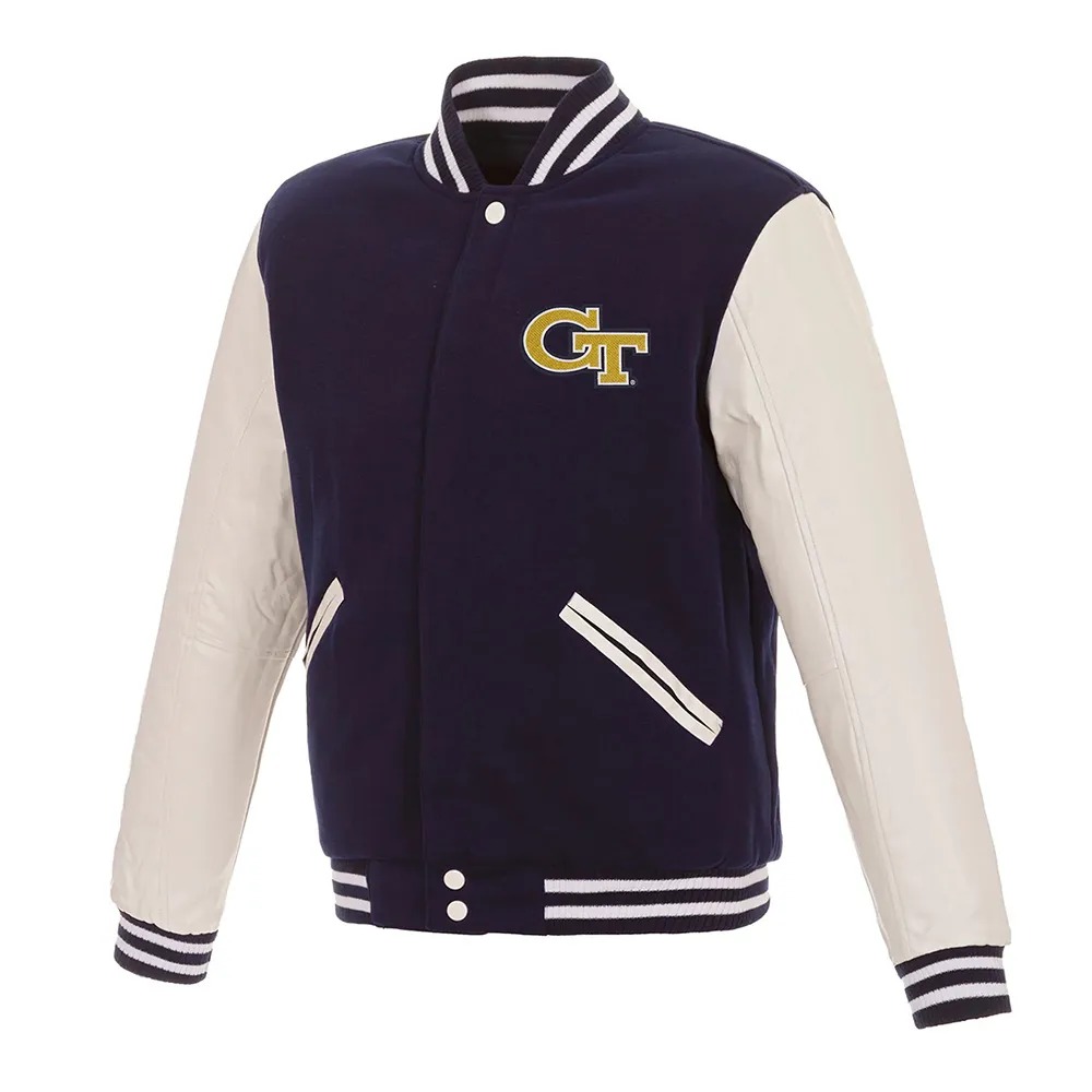 The Georgia Tech Navy and White Varsity Jacket is a stylish tribute to the tradition of college letterman jackets. Featuring the iconic school colors, this jacket is perfect for students, alumni, and fans who want to showcase their school pride. Its design reflects the rich history of varsity jackets, making it both a fashionable and meaningful addition to your wardrobe.