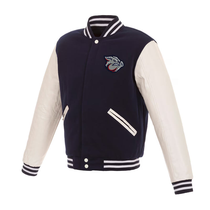 The Lehigh Valley Ironpigs Navy and White Varsity Jacket is a stylish tribute to the legacy and heritage of the Ironpigs minor league baseball team. Featuring classic varsity design, it embodies the pride, tradition, and passion of Ironpigs fans. The Lehigh Valley Ironpigs Navy and White Varsity Jacket goes beyond apparel, serving as a symbol of connection for collectors and supporters alike. Perfect for game days or casual wear, it celebrates the enduring culture and spirit of Lehigh Valley baseball.