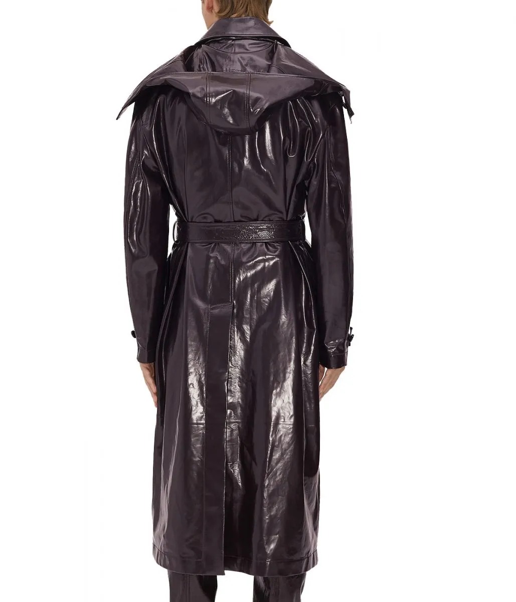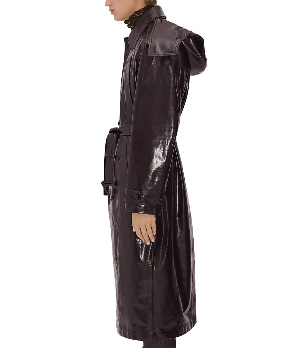 Men Shiny Belted Trench Coat with Removable Hood