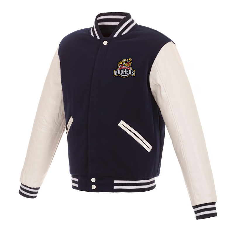 The Navy/White Toledo Mud Hens Varsity Jacket is a timeless tribute to the legacy and heritage of Toledo’s iconic minor league baseball team. Designed with classic varsity style, it embodies the pride, tradition, and loyalty of Mud Hens fans. The Navy/White Toledo Mud Hens Varsity Jacket goes beyond apparel, serving as a symbol of connection for collectors and supporters alike. Perfect for game days or casual wear, it celebrates the enduring culture and spirit of Toledo baseball and its devoted fanbase.