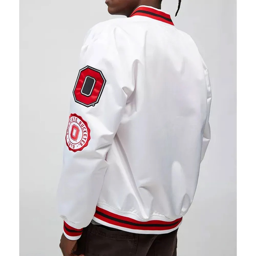 The Ohio State University White Satin Jacket is a premium piece of official Buckeye merchandise that seamlessly blends classic American style with vibrant school spirit. This jacket features a sleek white satin body, evoking the timeless look of traditional varsity letterman jackets worn by athletes for over a century. It serves as a proud symbol of affiliation with The Ohio State University, allowing students, alumni, and fans to showcase their pride in a sophisticated and sporty fashion. More than just apparel, this jacket is a wearable piece of OSU tradition, perfect for game days, campus life, or everyday wear to represent the Scarlet and Gray