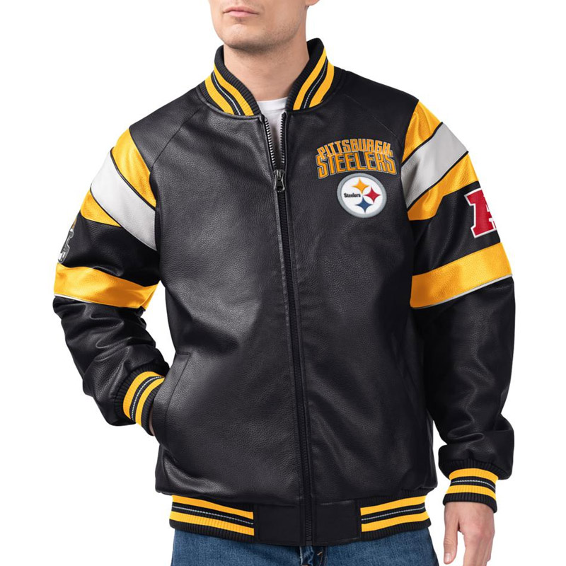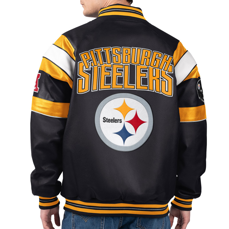 The Pittsburgh Steelers G-III Faux Varsity Leather Jacket blends classic varsity style with the proud NFL heritage of the Steelers. Celebrating the team’s history and iconic legacy, the Pittsburgh Steelers G-III Faux Varsity Leather Jacket embodies fan loyalty, pride, and commitment. Designed for collectors and devoted supporters, it connects timeless faux varsity leather outerwear with professional football tradition. This jacket is a statement piece representing team spirit, dedication, and the enduring legacy of the Pittsburgh Steelers franchise.
