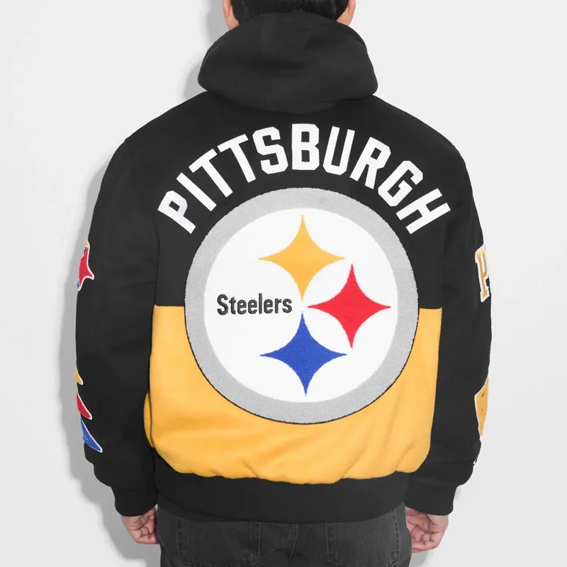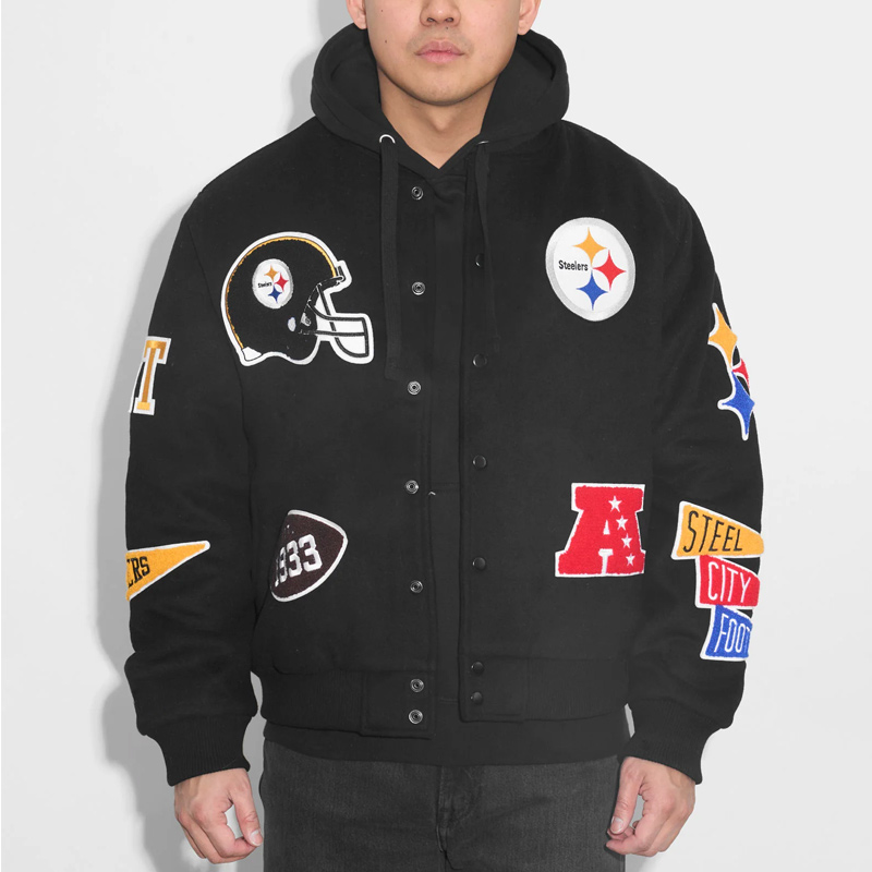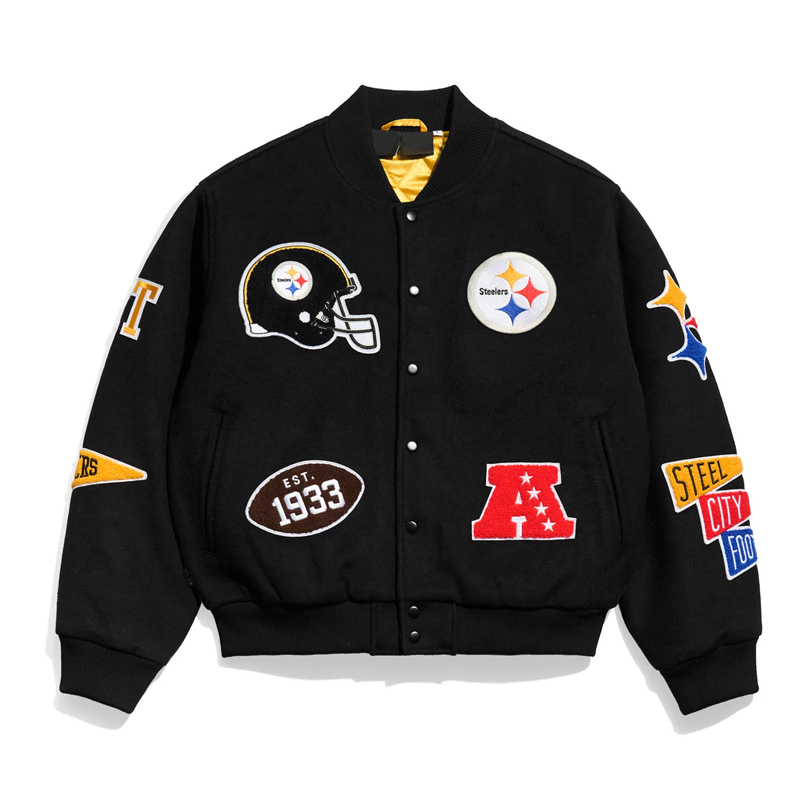 The Pittsburgh Steelers Pennant Black Varsity Wool Jacket merges classic varsity design with the proud NFL legacy of the Steelers. Celebrating the team’s history and iconic black-and-gold identity, the Pittsburgh Steelers Pennant Black Varsity Wool Jacket embodies fan loyalty, pride, and dedication. Designed for collectors and supporters, it connects timeless varsity wool outerwear with the cultural and sporting heritage of Pittsburgh football. This jacket serves as a statement piece, representing tradition, team spirit, and the enduring legacy of the Steelers franchise.