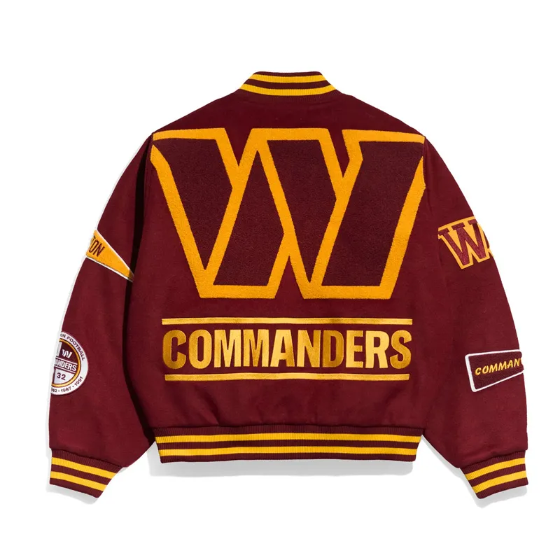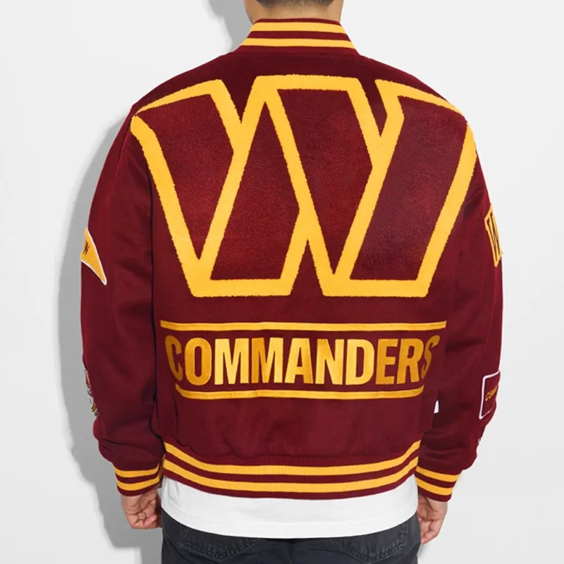 The Washington Commanders Pennant Burgundy Varsity Wool Jacket pays homage to the proud legacy of Washington’s NFL franchise. Celebrating its history, team pride, and evolving identity, this jacket stands as a timeless piece for loyal fans. Symbolizing strength and tradition, the Washington Commanders Pennant Burgundy Varsity Wool Jacket reflects the spirit of the team and its connection to generations of supporters. It represents not only the heritage of Washington football but also the passion of fans who carry its legacy forward.